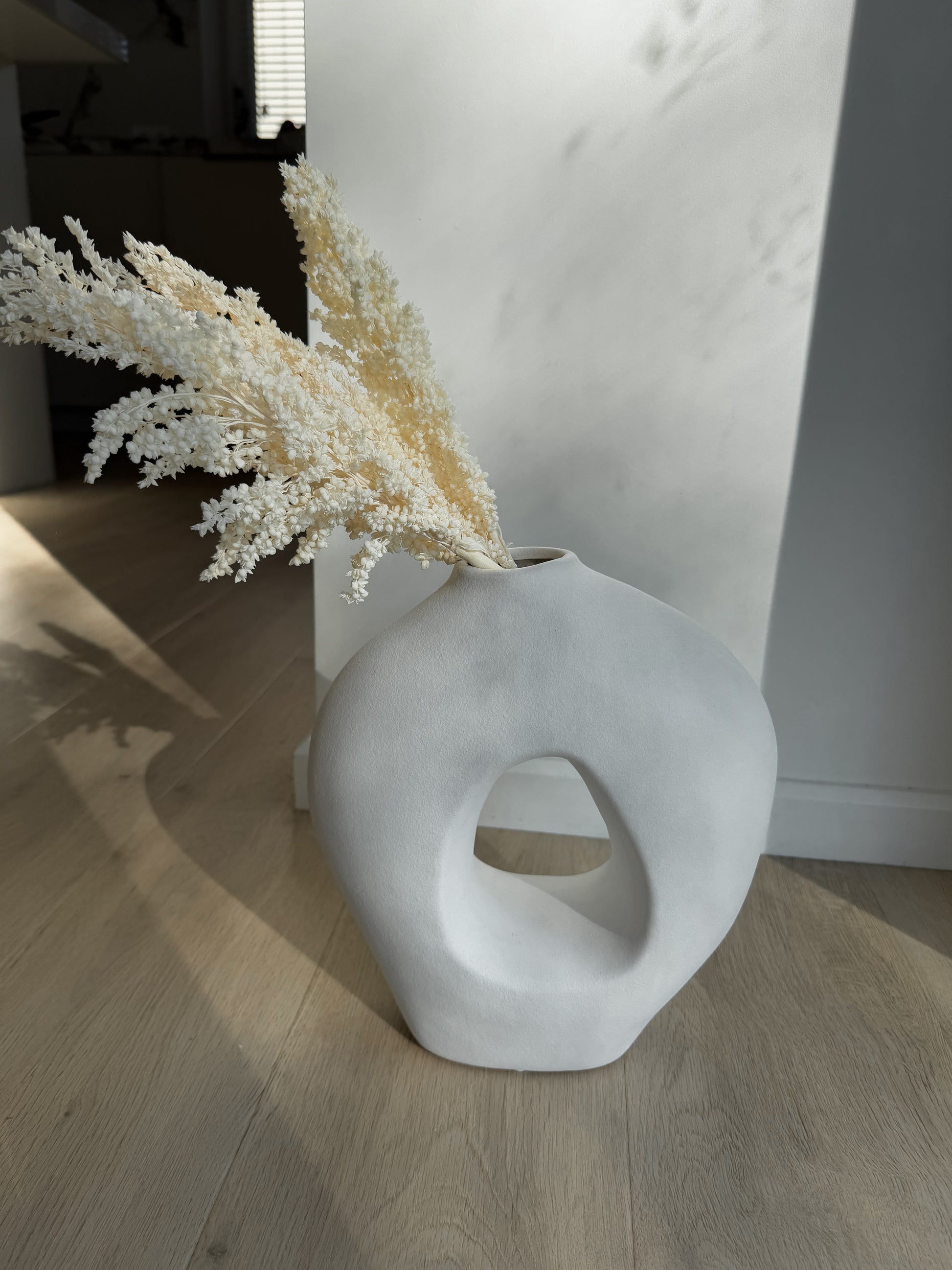 Minimalistinė stabilizuotų augalų kompozicija su skulptūrine baltos spalvos vaza.