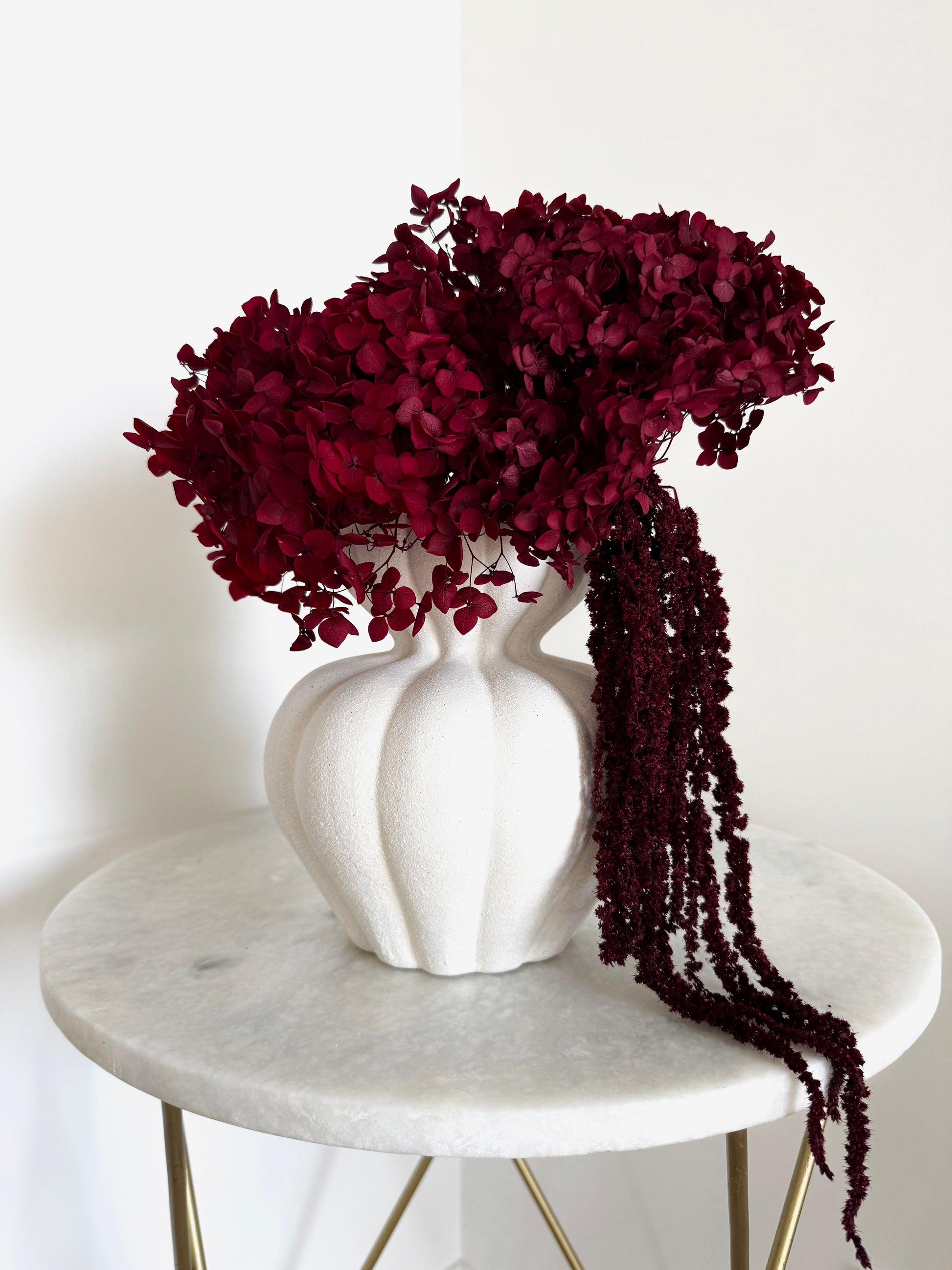 Stabilizuota burgundiška puokštė puikiai tinka minimalistiniam, prabangiam, moderniam stiliui.