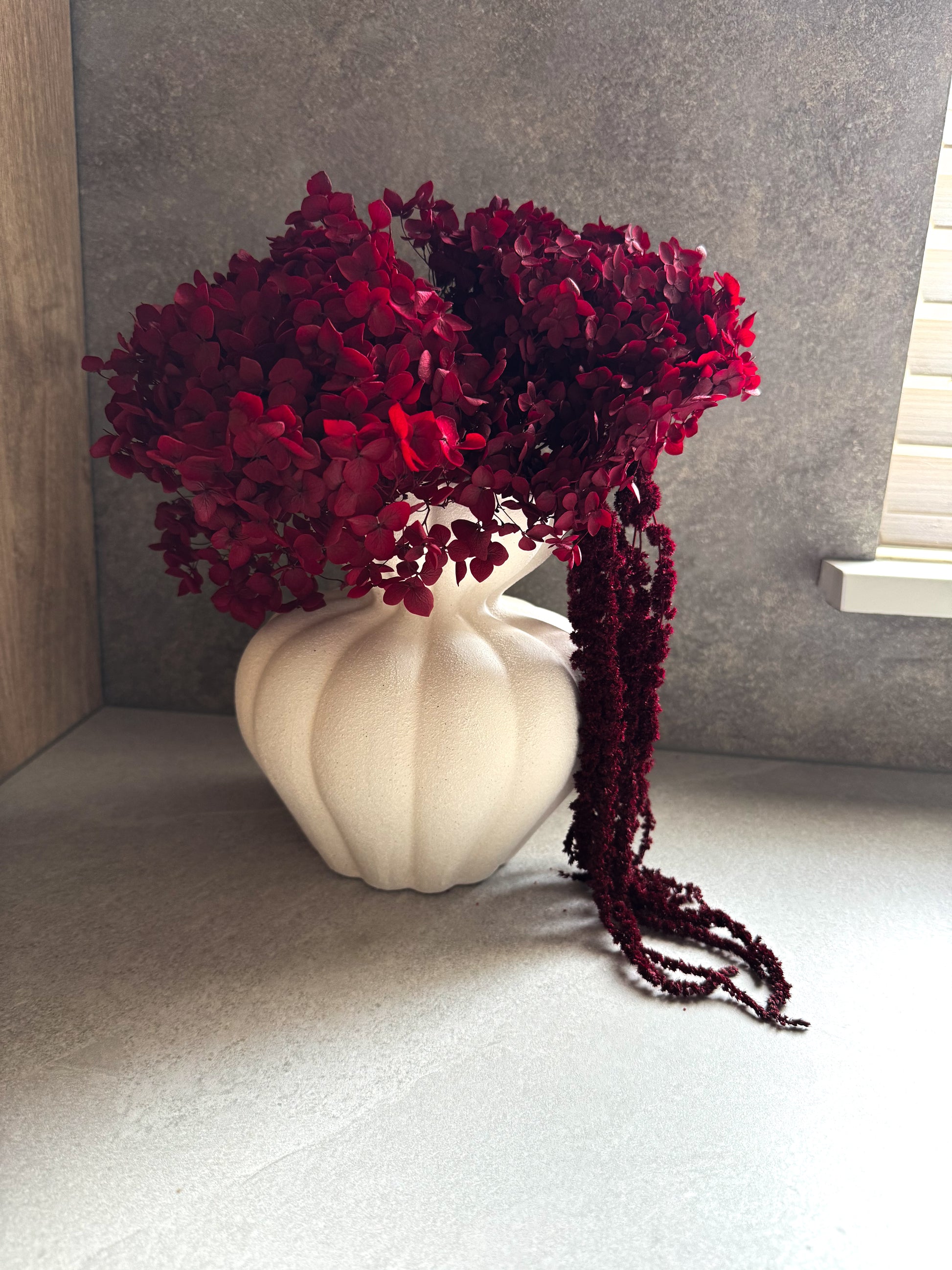 Į puokštę įeina: Burgundiška stabilizuota hortenzija + burgundiškas stabilizuotas burnotis.