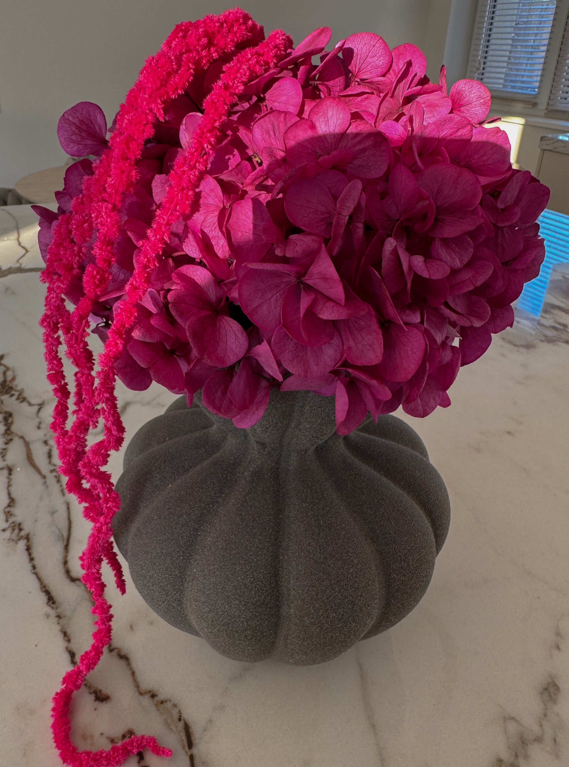Stabilizuotos hortenzijos ir burnočio puokštė puikiai tinka minimalistiniam, prabangiam, moderniam stiliui.