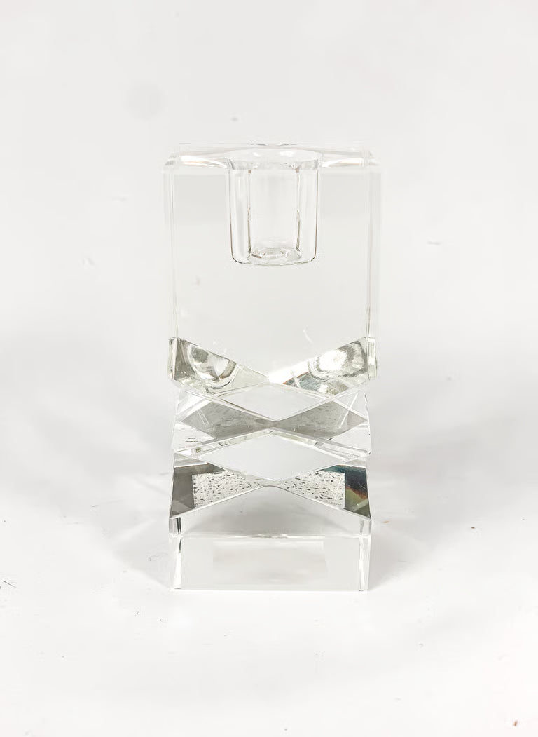 Skaidraus stiklo žvakidė, modernios formos.