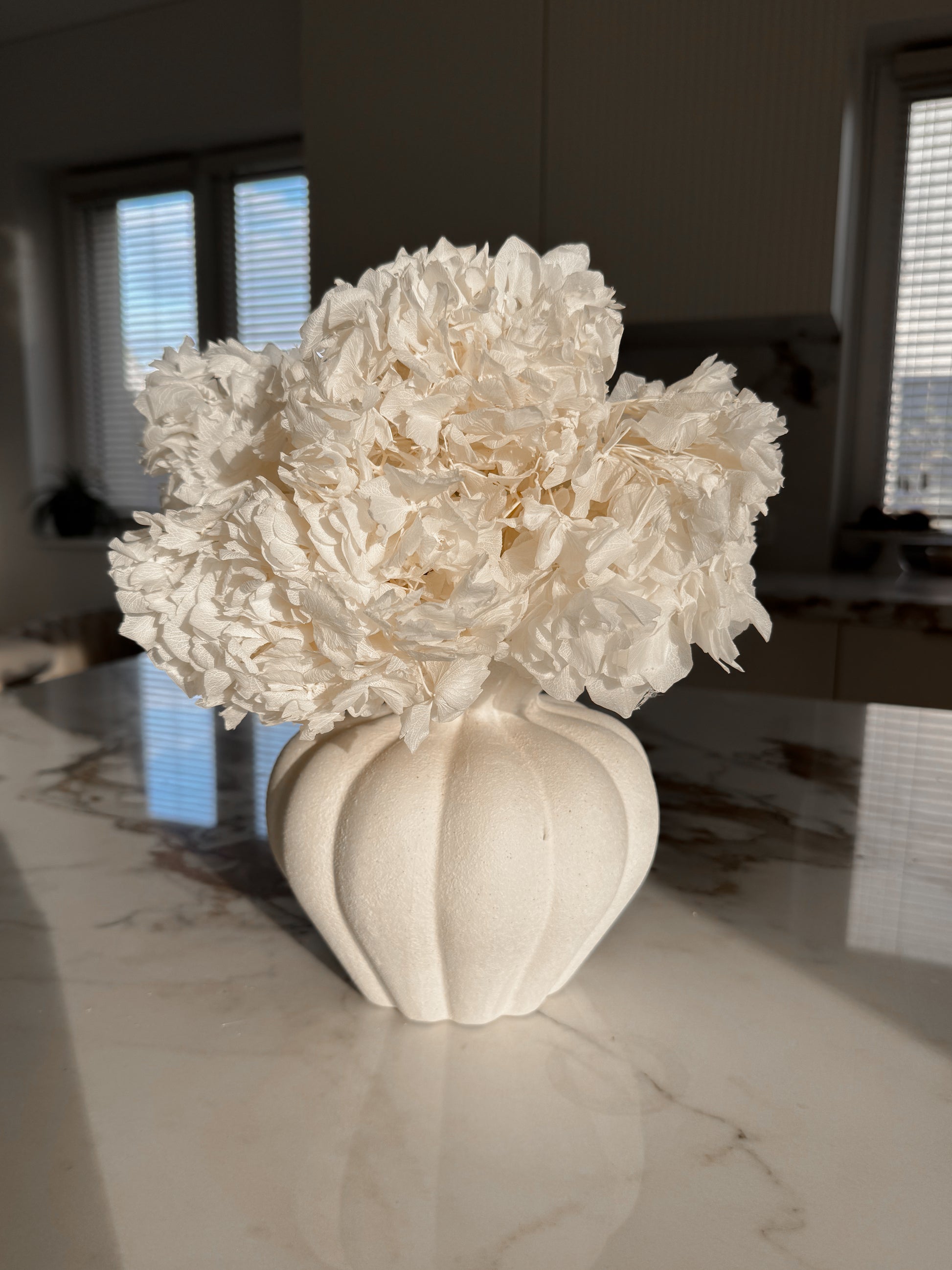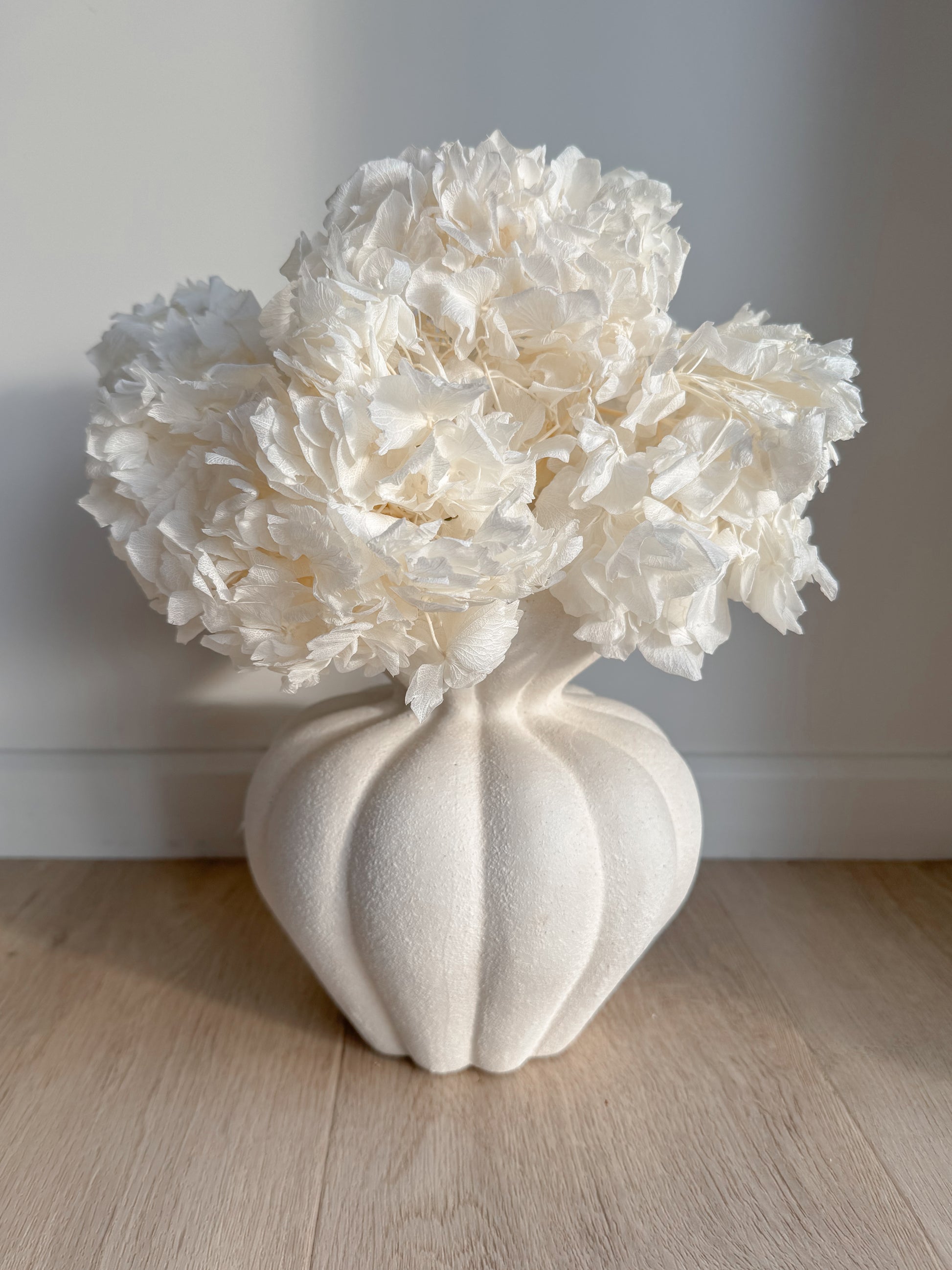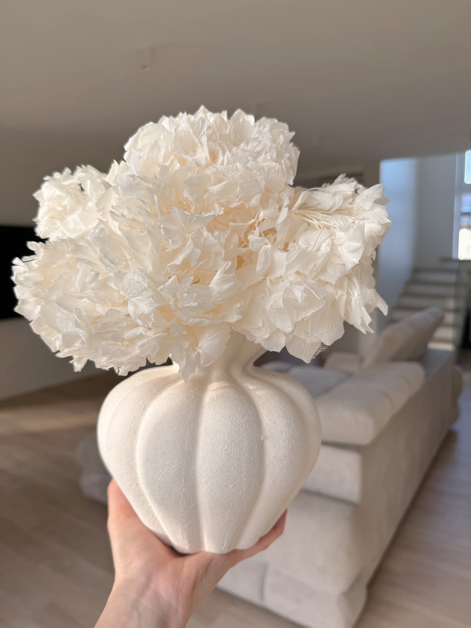 Stabilizuota Balinta Hortenzijų puokštė puikiai tinka minimalistiniam, prabangiam, moderniam stiliui.