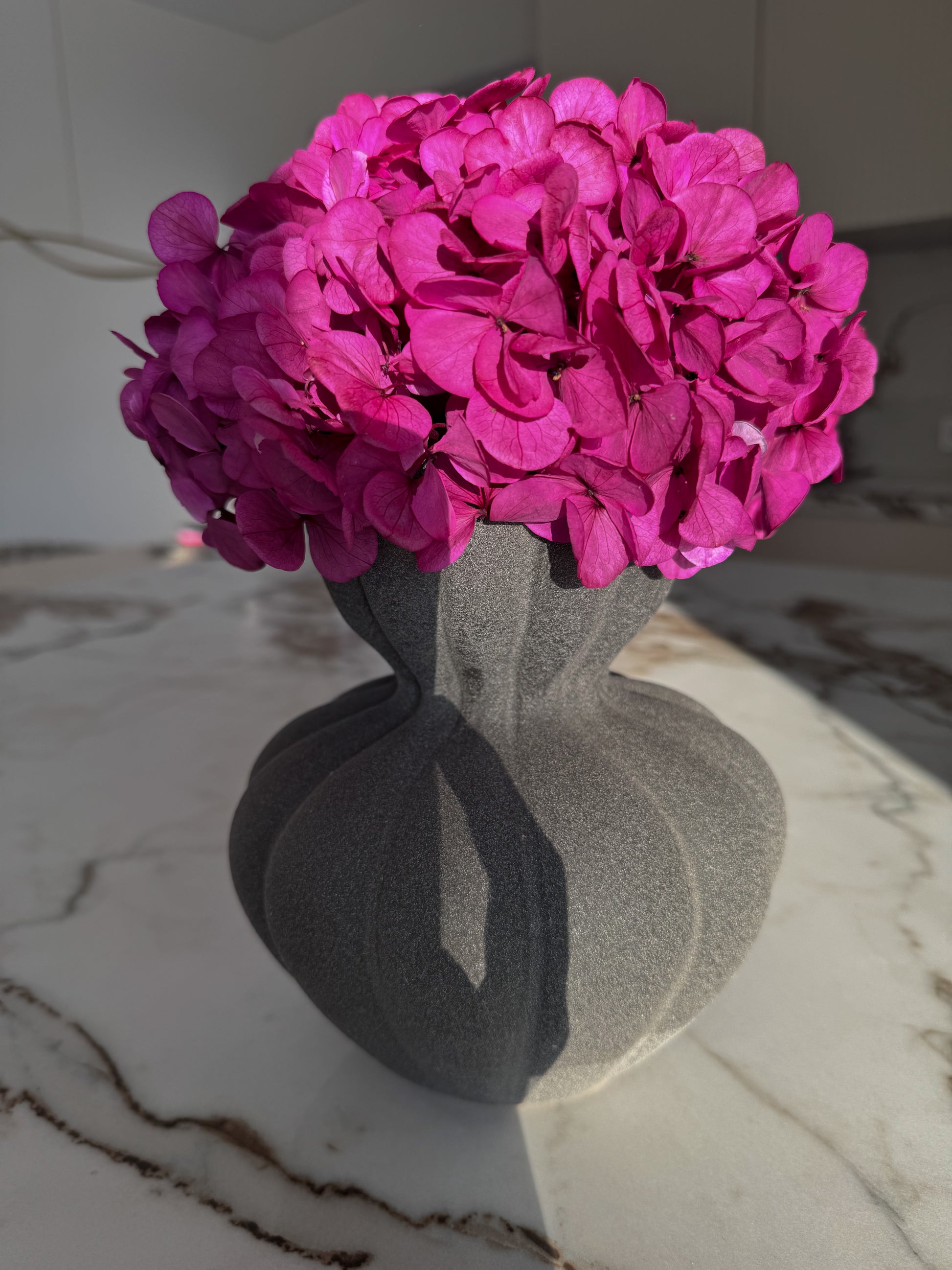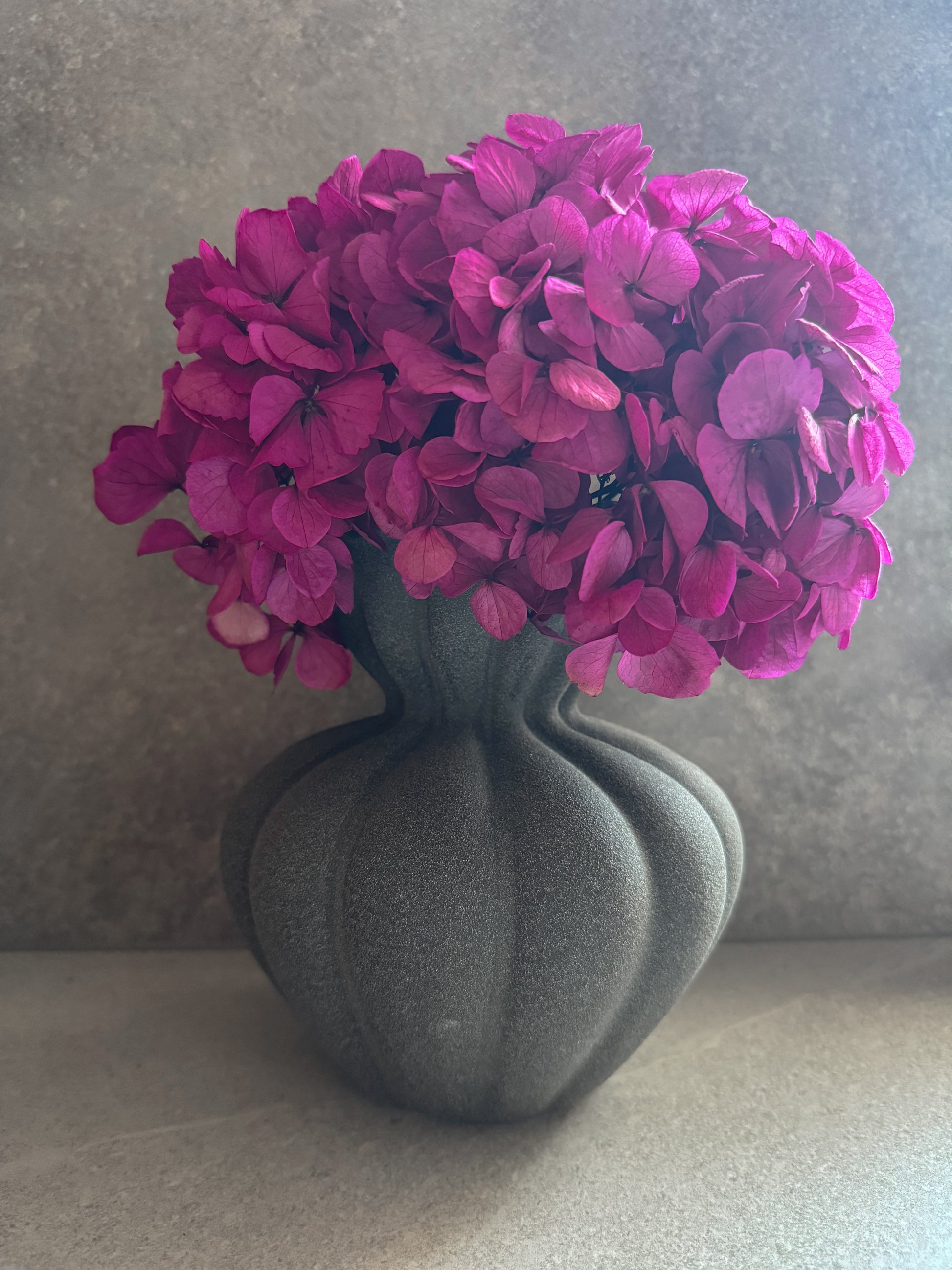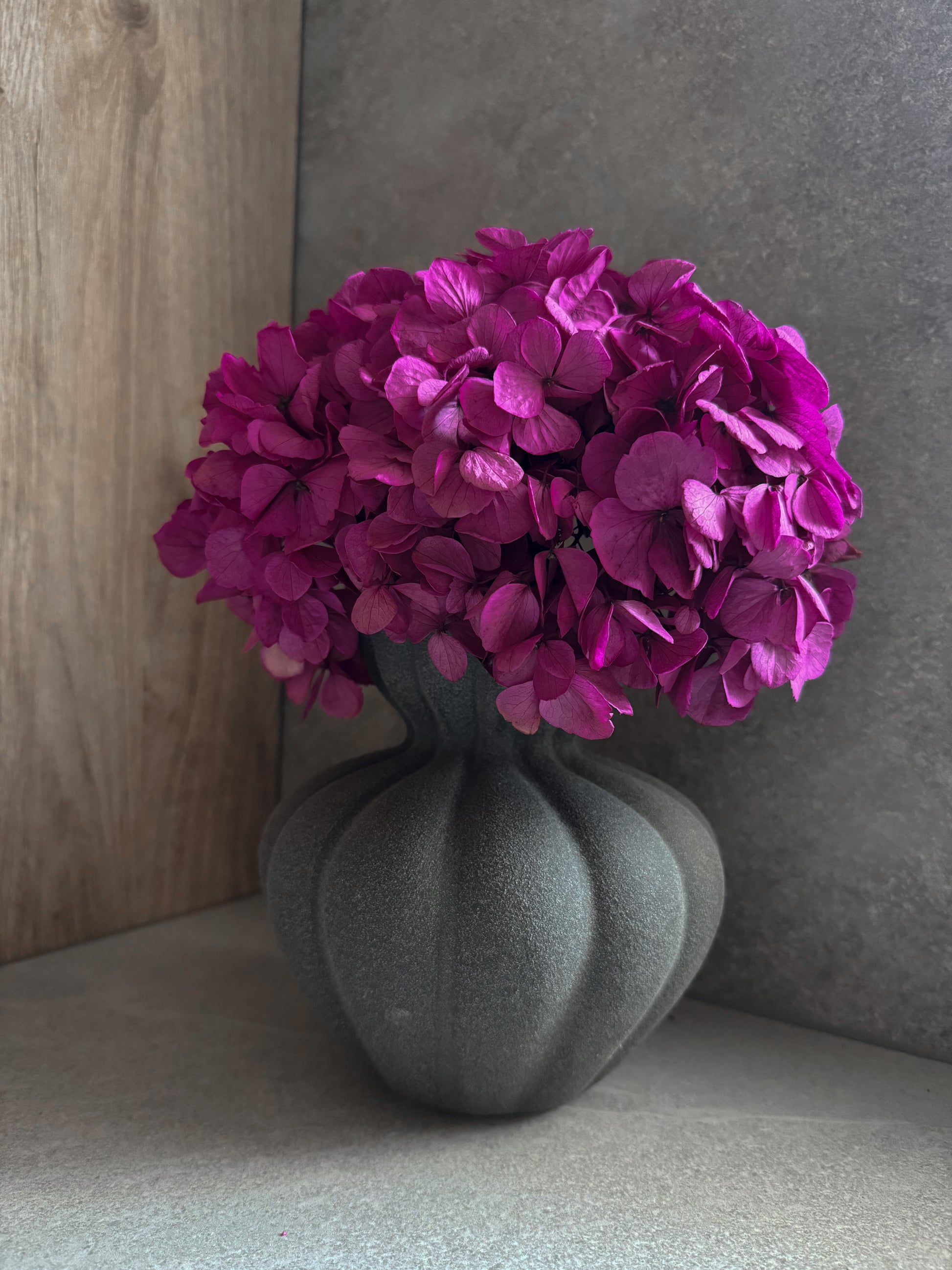 Stabilizuota hortenzija fuksijos spalvos kartu su vaza puikiai tinka minimalistiniam, prabangiam, moderniam stiliui.